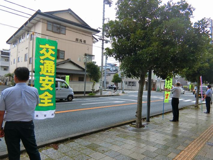 9月20日(月曜日)から30日(水曜日)の間、「秋の全国交通安全運動」を実施しました。この運動の一環として、期間に先立ち9月18日(金曜日)午前7時20分から午前8時まで浜北駅前交差点で職員がのぼり旗を持ち、「安全を つなげて広げて 事故ゼロへ」をスローガンにドライバー及び歩行者へ早朝街頭広報を行いました。