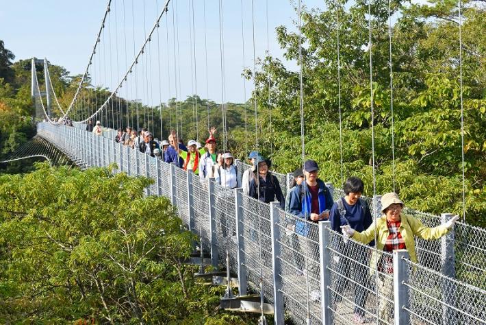 11月3日(日曜日)、浜北区北部の寺社や森林公園を巡る「はまきた名所めぐりウォーキング」を行いました。およそ320人の参加者が8.5kmのコースに挑戦。長さ150mの吊り橋「空の散歩道」や井伊家に縁のある大寶寺などを歩きながら、景色を眺めたり、写真を撮ったりして楽しんでいました。