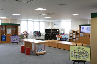2階の「防災いこいの場」を解放しています。展示エリアでは、涼みながら防災について学ぶことができます。
