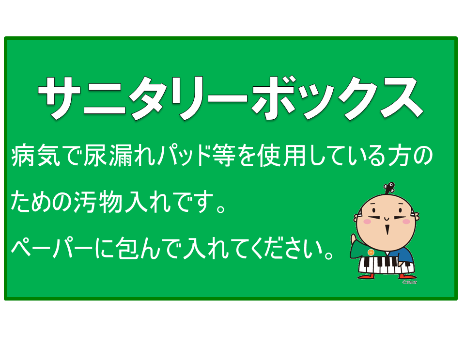 本市では「第2次がん対策推進計画」において、「がんになっても安心して暮らせる地域社会の構築」を施策の柱としていることから、公共施設の男性用トイレにおけるサニタリーボックス設置指針を策定し、設置を働きかけています。