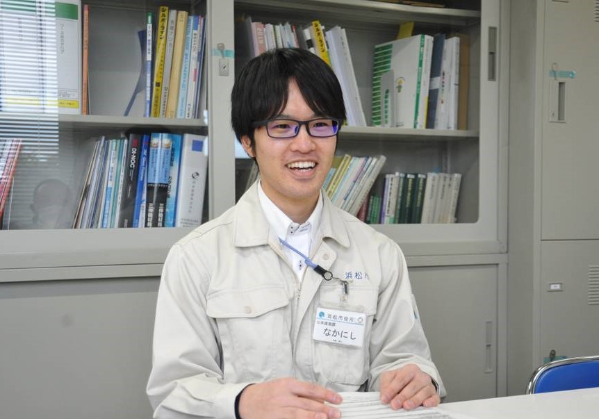 市役所を希望したのは、採用パンフレットなどで私が学んだ機械系の職種があることを知り、説明会に参加したことがきっかけです。その時、浜松市には様々な機械系の職員がいる部署があると聞き、幅広い業務を経験できるところに惹かれました。何より、先輩方の「浜松市に貢献したい」「市民の役に立てるように」という、この地を大切に想う気持ちを聞いて、私もそんな先輩方と一緒に働きたいと思いました。