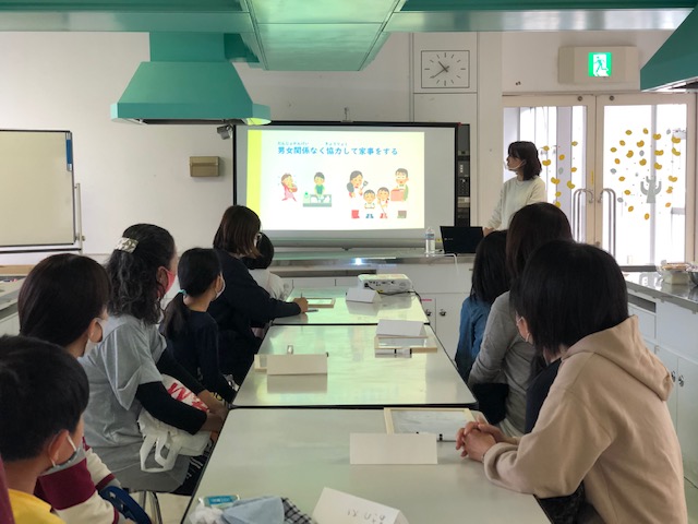 家事参加を通じて「生活力」を親子で学び、自ら考えて行動する「家事ワーク」を実践する講座を開催し、市内の小学生とその保護者10組24人が参加しました。