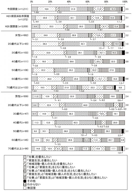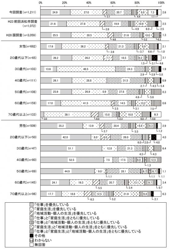 「家庭生活」が27.0%で最も高く、次いで「仕事」(24.9%)、「仕事と家庭」(20.7%)の順に高かった。他の項目はいずれも10%未満だった。「家庭生活」若しくは「仕事」で51.9%と過半数を占め、「仕事と家庭生活」(20.7%)と「仕事と家庭生活と地域活動・個人の生活」(7.3%)、「仕事と地域活動・個人の生活」(4.4%)を合わせたワーク・ライフ・バランスがとれているとする回答の32.4%を上回った。前回調査と比較すると、「仕事」の割合が3.3ポイント上昇した。国の調査と比較すると、浜松市は「家庭生活」の割合が3.5ポイント低い。