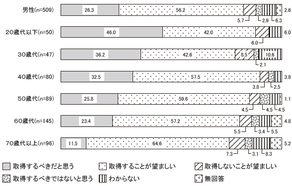 年齢別でみると、「取得するべきだと思う」の男女とも年齢が若いほど回答割合も高まる傾向がみられた。その傾向は男性の方が強く、20歳代男性は46.0%と全体よりも20.4ポイント高かった。同年代の男女を比較すると、20歳代以下~50歳代は男性の方が「取得するべきだと思う」の回答割合が高かった。