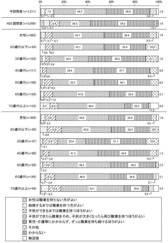 「子供ができたら職業をやめ、子供が大きくなったら再び職業を持つほうがよい」が44.3%で最も高かった。次いで「育児・介護等にかかわらず、ずっと職業を持ち続けるほうがよい」が36.9%で高く、上位2 項目で81.2%を占めた。「女性は職業を持たない方がよい」(0.7%)、「結婚するまでは職業を持つほうがよい」(3.5%)、「子供ができるまでは職業を持つほうがよい」(7.3%)はいずれも少数意見だった。