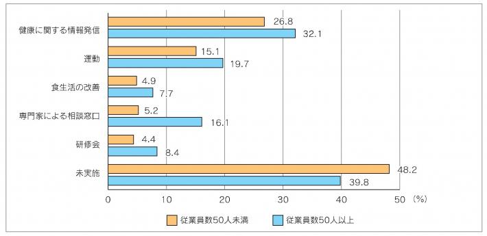 平成28(2016)年度実施の「事業所へのアンケート調査」において、従業員の健康づくりを支援するための取り組みは、健康に関する情報発信が約3割で最も多く、未実施は4割以上ありました。