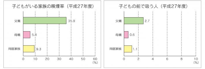 子どもがいる家庭の喫煙率、子どもの前で吸う人ともに父親が最も多いです。