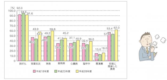 たばこは、さまざまな病気の発症や死亡に深く関係しており、たばこを吸っている人だけでなく、周囲の人にも影響が及ぶため、たばこが及ぼす健康被害への対策が重要です。特に、未成年者や妊産婦の喫煙については、社会全体での取り組みが必要となっています。