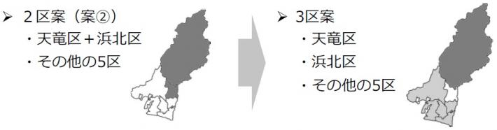 3区案は、この2区案を基にしながら、意見を聴く会等で地域の皆様から様々なご意見などを伺い、天竜区は、過疎対策など地域の特性に即した対応が必要であること、浜北区は、副都心として位置付けられていることなどを踏まえるとともに、区自治会連合会等からの要望を受け止め、これらを総合的に勘案し、新たに提案したものです。