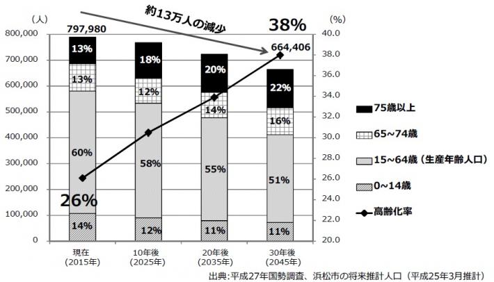 30年後(2045年)には、総人口が約13万人、生産年齢人口が約3割減少し、5人に2人が高齢者に