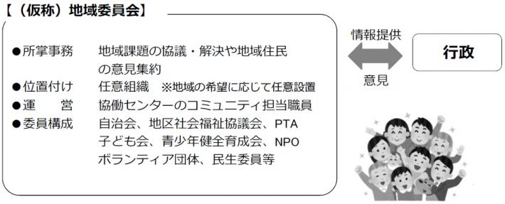 (仮称)地域委員会を協働センター単位で設置し、地域課題の解決・協議や地域住民の意見集約、地域団体の活動連携などを進めます。