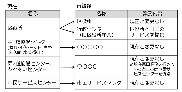 区役所、行政センターの位置 再編後の第1種協働センター、ふれあいセンターの名称 市民の皆様のご意見等を踏まえ、再編案内定までに決定 |