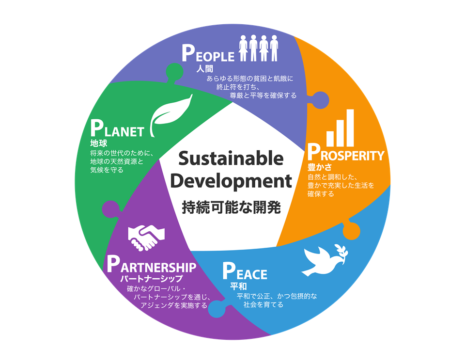 SDGsの17ゴールは、2030アジェンダの前文に記載された持続可能な開発のキーワードである「5つのP」を具現化したものです。