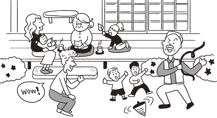 子育てに関する悩みがあっても、近所に住む「じぃじ」、「ばぁば」に気軽に相談でき、子育てのノウハウを持つボランティアもサポートしてくれます。子育てに関する知識が世代間で伝承され、一人で悩み、抱え込むようなことはありません。また、地域主体の育児サークルが活発に活動しているほか、地元のお祭りやスポーツ、昔ながらの遊びを通して、地域ごとに特色のある子育て方法も生まれています。