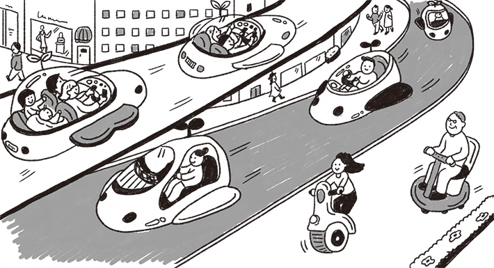 移動手段は、電車やバスなどに加え、地域や企業などが所有する乗り物をシェアし、乗り合いながら利用しているため、渋滞は緩和されています。個人で自家用車を持ち、運転を楽しむ方もいますが、安全性能が高く、環境への負荷が少ない乗り物がほとんどです。市街地での移動手段は、徒歩を中心としていますが、エコな1人用の乗り物もあります。道路は、歩道と車道が明確に区分され、交通事故は減少しています。また、居住地の集約によって、不要となった道路は廃止され、他の用途に活用されています。