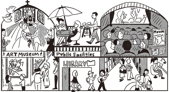 公共施設についても考え方が見直されました。点在していた公共施設の機能を1つの建物に集約したり、図書館だった施設に民間事業者が運営する映画館やカフェを併設したり、多様な機能を併せ持つ施設が整備されています。また、美術館が、休日には結婚式場、夜にはディナー会場になるなど、様々な用途として柔軟に活用されています。民間事業者やNPO法人などが運営母体となり、使い勝手の良い施設として、質の高いサービスを提供しています。