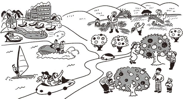 大自然の恵みを体感できる中山間地域では、農作物の収穫、蕎麦打ち、森林での作業などをはじめとした体験型の観光が人気です。首都圏などからの観光客も増え、顔の見えるあたたかい結びつきが居心地の良さにつながり、体験者には、「もうひとつのじぃじ、ばぁばんち」として親しまれています。多くのリピーターが集まり、中には移住した人も見られます。