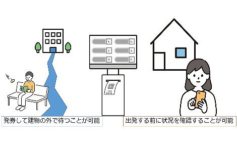 多機能発券機/発券して建物の外で待つことが可能(左)、出発する前に状況を確認することが可能(右)