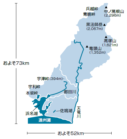 浜松市は、首都圏と関西圏の二つの経済圏のほぼ中間に位置し、面積は静岡県の約2割を占めています。地形は、天竜川中流域の急しゅんな中山間地域、浜名湖北岸のなだらかな山地、天竜川沿いの低地、三方原台地、浜名湖から太平洋沿岸部にかけての低地によって構成されています。