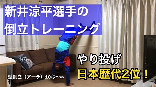 やり投げ日本歴代2位の記録を持つ新井涼平選手が紹介する「倒立トレーニング」です。時折見せる新井選手のお茶目な表情にもご注目ください(笑) 動画で紹介しているように段階を踏んで倒立のトレーニングを行いましょう!