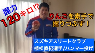 握力120キロ超のハンマー投げトップアスリート・植松直紀選手が紹介する「握力トレーニング」です。特別な機器は使用せず自宅にあるもので鍛えることができます。植松選手のような規格外のパワーを目指しましょう!