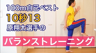 100mの自己ベスト10秒13の記録を持つ原翔太選手が紹介する「バランストレーニング」です。実際に走っている時と近い動きを行い、体全体のバランス感覚を鍛えましょう!