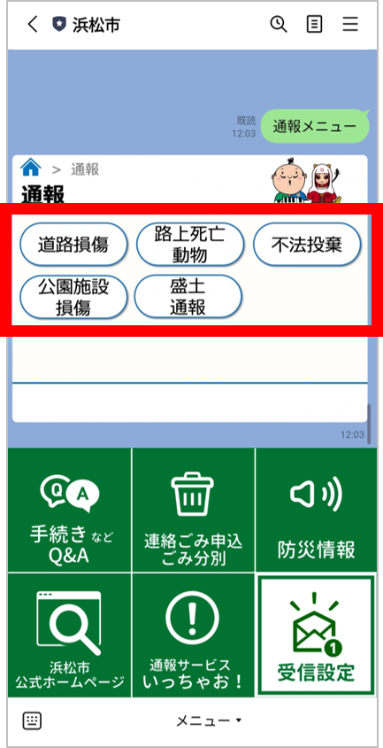 浜松市公式LINE「しゃんべぇ情報局」を友だち登録後、トップメニューから「通報サービス いっちゃお!」を選択すると各通報メニューのボタンが表示されますので、画面上の案内に沿ってご利用ください。