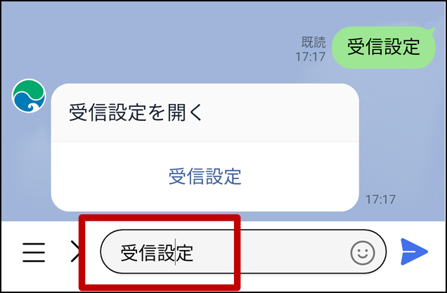 「受信設定」と入力して送信ボタンを押すと「受信設定を開く」というリンクが出現しますので、そちらをタップして受信設定にお進みください。