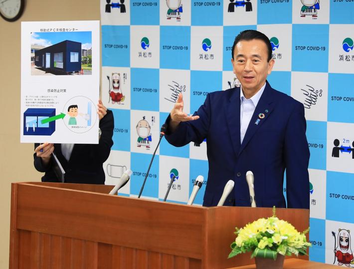 市長:浜北に工場があるということで、今回ご協力をいただきました。これであれば、もし、もっと必要な場合でもどんどん台数を追加できますので、いざというときにはさらに検体数を増やすこともスピード感をもってできるということで、非常に私は良い方式だなと思っております。
