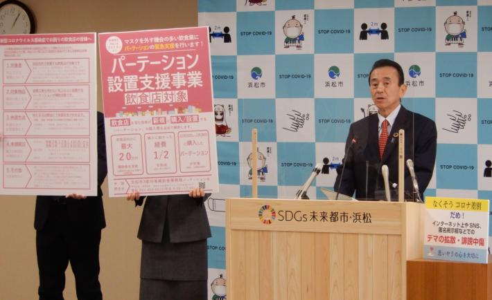 市長:やはり、クラスターが発生しますと、一旦は戻り始めたお客さんがどうしても遠のいてしまいますし、浜松の場合、比較的企業が多いものですから、クラスターが発生しますと、どうしても会社の方でそうした飲み会等への足止めが発生して、飲食店が苦境に立たされる面があります。しっかり感染症対策を施して、できるだけ少人数で食事をしていただくことはそれほど危険ではございませんので、飲食店にもこのような感染症対策をしっかりしていただいて、市民の皆さまに安心・安全であるということを発信していきたいと思っています。