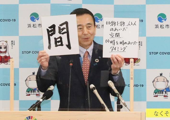 市長:今年は「間」でございます。「あいだ」とも読みますし、「カン」あるいは「ま」とも読みます。これは、物と物の間、人と人の間のような空間のことや、時と時の間のような、いわゆるタイミングを記す一字となっています。例えば「空」の字と組み合わせれば「空間」、「時」の字と組み合わせれば「時間」、「隔」の字と組み合わせれば「間隔」、「合」の字と組み合わせれば距離やタイミングのことを指す「間合」となります。勘の良い方ならもうお分かりだと思いますが、今年はコロナの一年となりましたけれども、一番大事なのはソーシャルディスタンス、いわゆる「空間」を確保すること、それが感染症対策の一丁目一番地であります。また、一方で、私もいつも申し上げておりますけれども、デュアルモードということで、安全対策と経済対策を巧みに切り替えていくことが必要です。そういう意味で、そのタイミングである「間(ま)」も重要なわけです。それを間違えると、「間が悪い」ということになってしまいますので、感染症対策を強化するときと経済対策に力を入れていくときを、タイミングよくやっていくという意味の「間(ま)」でもあります。ということで、このコロナ禍において重要なワードとして、今年はこの「間(あいだ、ま、カン)」の字を選ばせていただきました。