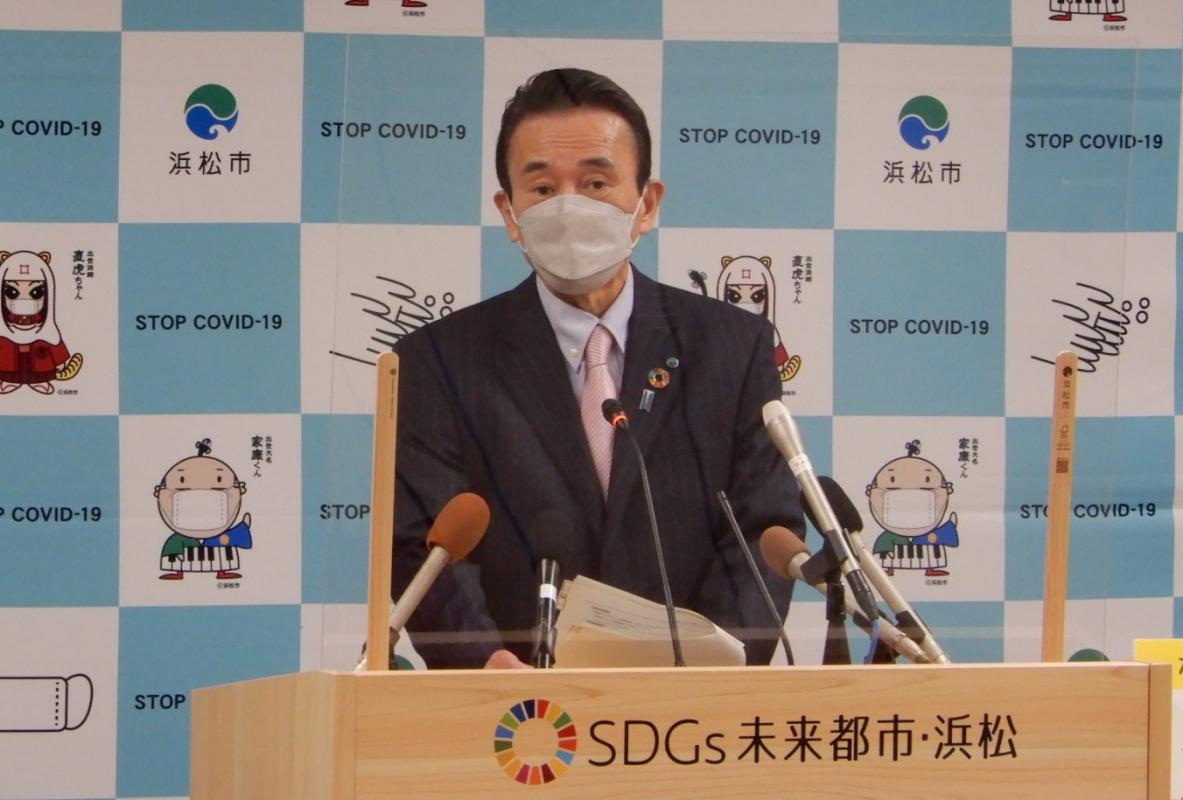 本市では昨年10月以降、3カ月間で新型コロナウイルスの感染者が31人と落ち着いた状況で推移していましたが、年末年始における感染拡大地域からの帰省や旅行などの影響により、年明けから感染者が急増し、1月13日には166人、翌14日には172人と、2日連続で1日当たりの感染者の最多を更新し、昨日までの月の累計感染者数は690人となっています。1月6日に本市における「オミクロン株確認」の発表をしましたが、沖縄や東京などの他の地域と同様、オミクロン株が感染急拡大の要因になっているものと思われます。本市における感染者の傾向ですが、若い世代の感染が顕著で20代が38.3%と最も高く、30代以下が全体の8割ほどを占めています。こうした中で、市内の学校の部活動でクラスターが発生したこともあり、市立の小学校、中学校および高等学校においては、改めて教育委員会が策定したマニュアルに基づき、3密の回避や換気の励行、手洗い、マスクの着用などの対策を徹底するほか、感染状況に応じた学級閉鎖等を実施します。なお、児童生徒が登校できない場合においてもタブレット型端末の活用などにより、学びを止めることがないように対応していきます。また、家庭での感染症対策につきましては、学校にウイルスを持ち込まないことが重要であることから、登校前の健康チェックをはじめ、改めて各家庭での対策の徹底をお願いしていきます。次に、感染者のワクチン接種状況については、とりわけ10代、60代以上の年代で、市の平均接種率を相当下回っており、ブレークスルー感染はありますが、ワクチンの感染防止効果がうかがわれる結果となっています。また、本市の特徴として、外国籍の方が全体の33%ほどを占めていることから、情報弱者になりがちな外国人市民への感染症対策として、浜松国際交流協会と連携しながら早急に多言語化した注意喚起動画をホームページやSNSに掲載し、NPOの市民団体や外国人支援関係機関への周知を徹底していきます。オミクロン株のもう一つの特徴として、デルタ株より重症化しにくいことが挙げられます。本市でもオミクロン株が疑われる感染者は軽症か無症状の方がほとんどで、自宅での療養が中心となっており、入院患者は14日現在17人と、第5波のときのように感染者増加に比例して医療がひっ迫するという状況にはなっていません。しかしながら、感染者がさらに急増した場合には、入院を要する感染患者も増えますので、予断を許さない状況に変わりはありません。本市としましては、医療機関、医療関係団体と連携する中で、抗体薬や経口薬を活用し、早期に治療につなげることで、重症化予防に努めていきます。この後、詳細をお知らせしますが、ワクチン接種につきましても1月7日発表のスケジュールを前倒ししていくことにしました。市民、事業者の皆さまに改めて基本的な感染予防対策の徹底のご協力をお願いします。