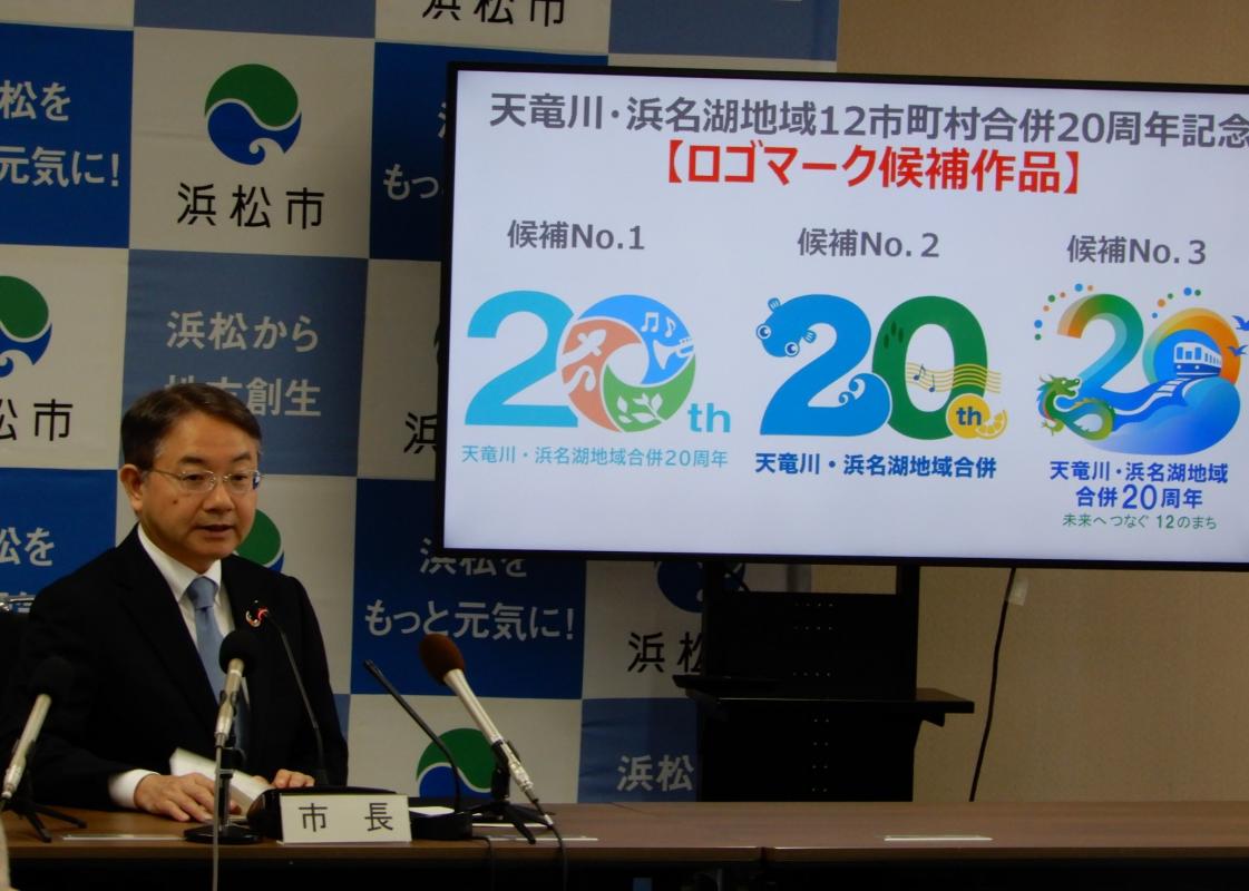今年7月1日(火曜日)、本市は天竜川・浜名湖地域の12市町村合併から20年という大きな節目を迎えることとなりました。この合併20周年を市内外に広く周知するため、各種イベントなどに使用するロゴマークを決定していきたいと思っています。このロゴマークは、市民の皆さまからオンライン投票をいただき、決定します。候補として3作品用意をしています。