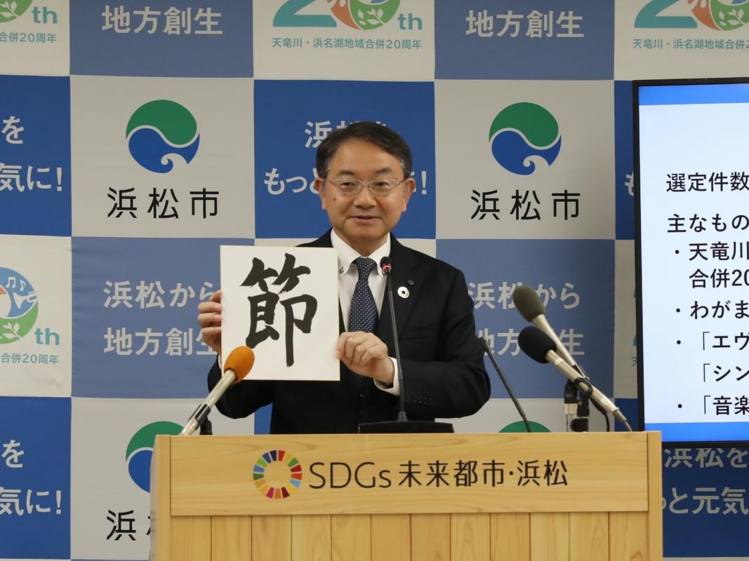 市長:先般、清水寺で発表された今年の一字は「熊」だったと記憶しています。次点が「米」であったという話も伺い、世相を反映した漢字だと思いました。浜松市にとって今年がどのような1年であったかを振り返りますと、今年は昭和100年や戦後80年であり、日本とブラジルの外交関係樹立130周年、そして12市町村合併から20年という「節目の年」でした。そうしたことから、「節」を選びました。これまでの来し方を振り返るとともに、先に向けて新たに踏み出す年になったと思っています。竹も「節」があるからこそ、すくすくとまっすぐ、しなやかに育ちますので、この節目の年を大切にしながら、これからも浜松がさらに素晴らしいまちに発展していくことを願っています。