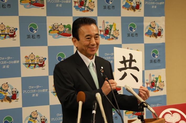 市長:共生の「共」の字です。今年の4月に、いわゆる入管法が改正され、いよいよ日本が本格的に外国人を受け入れる社会になってきました。浜松が進めてきた多文化共生を今後も大いに促進していくという点でも、共生というのは非常に重要なキーワードとなっています。