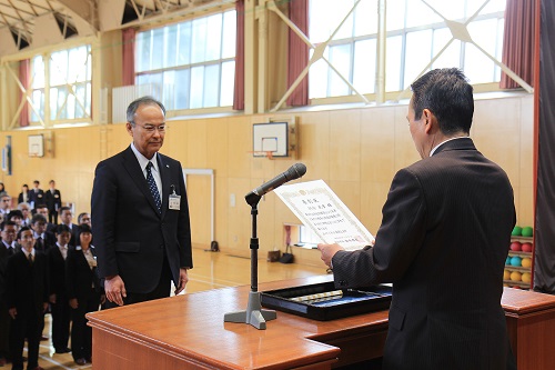 さて、皆さまこれからは第二の人生を歩まれることと思います。新しい仕事に就かれる方、引退される方さまざまだと思われますが、これからが新たな人生の始まりだと思います。皆さまも日野原重明先生をご存じのことと思いますが、私も時々お会いします。現在104歳でいらっしゃいますが、かくしゃくとされておりまして30分くらいの講演でありましたら、いまだに立ったまま講演されるくらいお元気でいらっしゃいます。その先生が提唱されました「新老人」という概念がございまして、75歳からが本当の意味での高齢者であり、それまではまさに現役であるということであります。つまり60歳から75歳まではまだ15年もありますので、まだまだ皆さまにとっては活躍の場がたくさんあるということです。さまざまな分野でこれからも輝いていただきたいと思いますし、市に関わる仕事をされる皆さまもいらっしゃると思いますので、ぜひ引き続き市政を温かくお見守りいただきたいと思います。