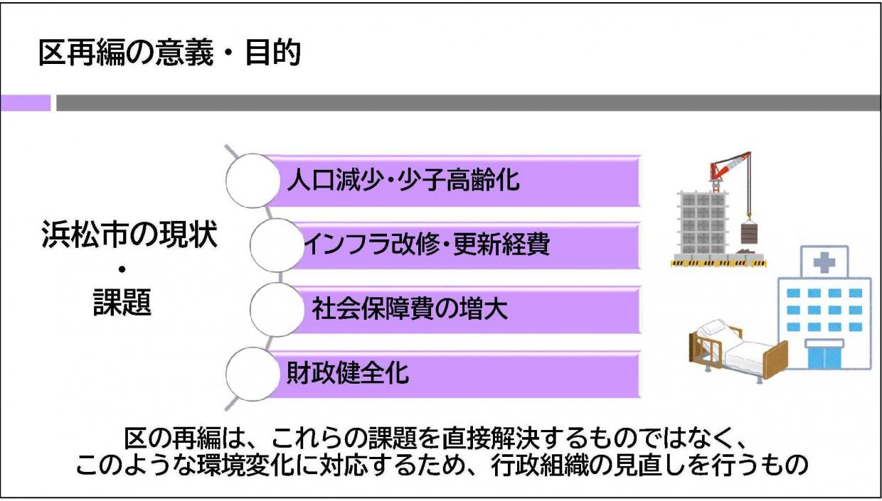 浜松市を取り巻く現状・課題には、人口減少・少子高齢化をはじめ、様々なものがあります。区の再編は、これらの課題を直接解決するものではなく、このような環境変化に対応するため、行政組織の見直しを行うものです。