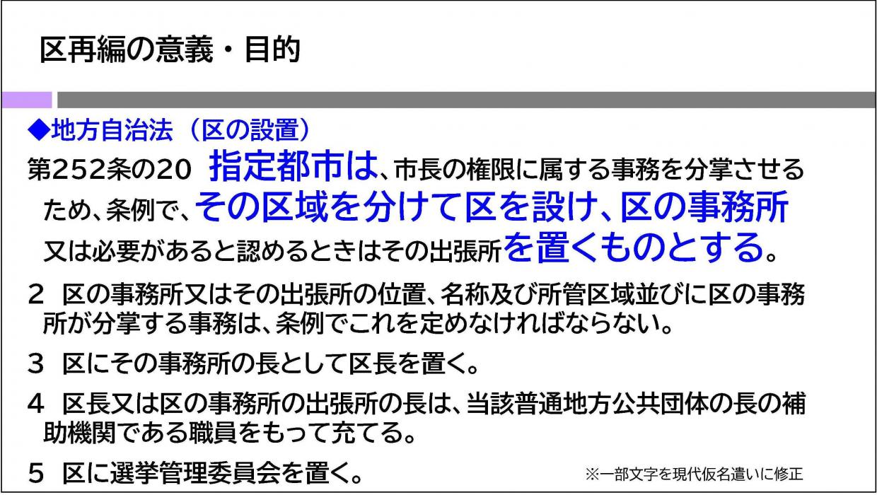 指定都市は、市の区域を分けて「区」を設けており、地方自治法で、2つ以上の区を設置することが義務付けられています。