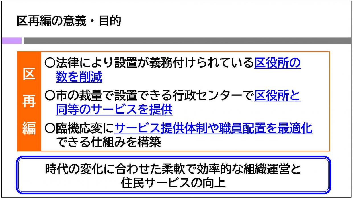 区再編により、法律で設置が義務付けられている区役所の数を削減し、行政センターで区役所と同等のサービスを提供するなど、市の裁量で臨機応変にサービス提供体制や職員配置を最適化できる仕組みを構築することで、時代の変化に合わせた柔軟で効率的な組織運営と住民サービスの向上を図ります。