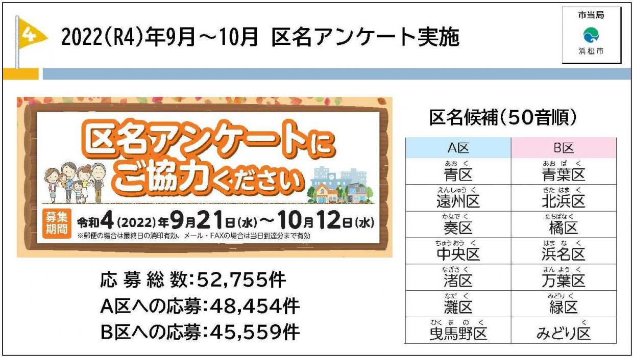 2022年9月~10月にかけ、区名候補7案から1つを選んでいただく区名アンケートを実施し、52,755件のご応募をいただきました。