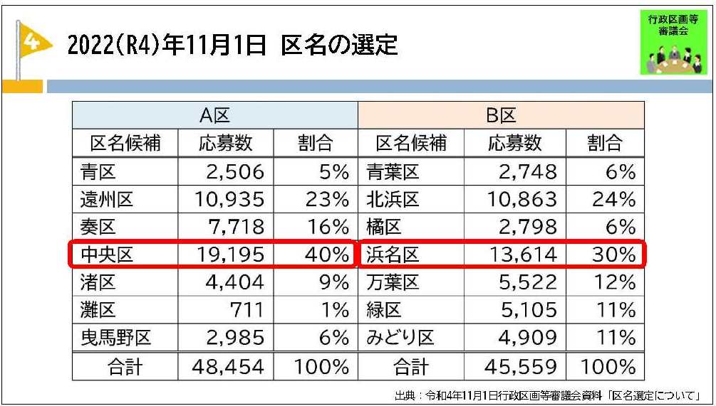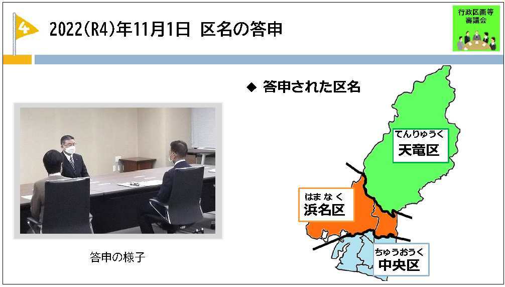 行政区画等審議会では、区名募集、区名アンケートの手順により市民の意向を確認するとともに、特別委員会の意見を参考とした上で、委員の協議により、再編後の区の名称について、南側から中央区(ちゅうおうく)、浜名区(はまなく)、天竜区(てんりゅうく)と答申されました。