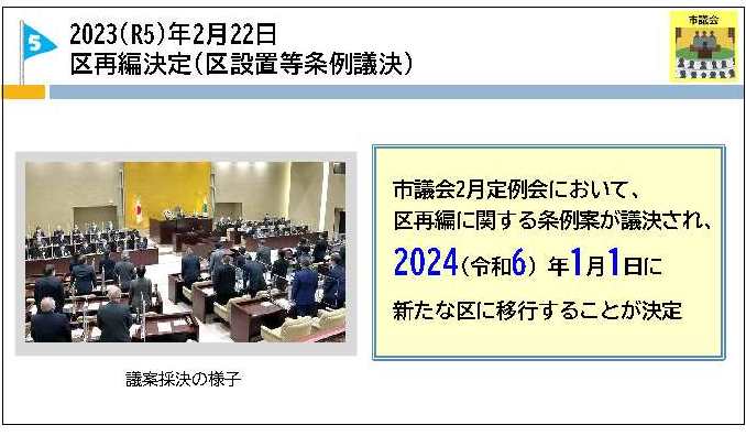 令和5年2月22日に区再編に関する条例案が議決され、2024(令和6)年1月1日に新たな区に移行することが決定しました。