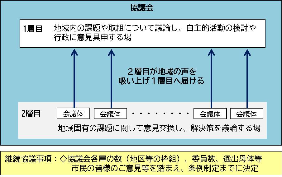 - 今回の提案は、協議会の内部を2層化し、1つの大きな協議会の中に、より地域に密着する小さい単位の協議体(2層目)と、その意見を集約し、全体的に総括し市に届ける協議会(1層目)を設ける2層構造としています。