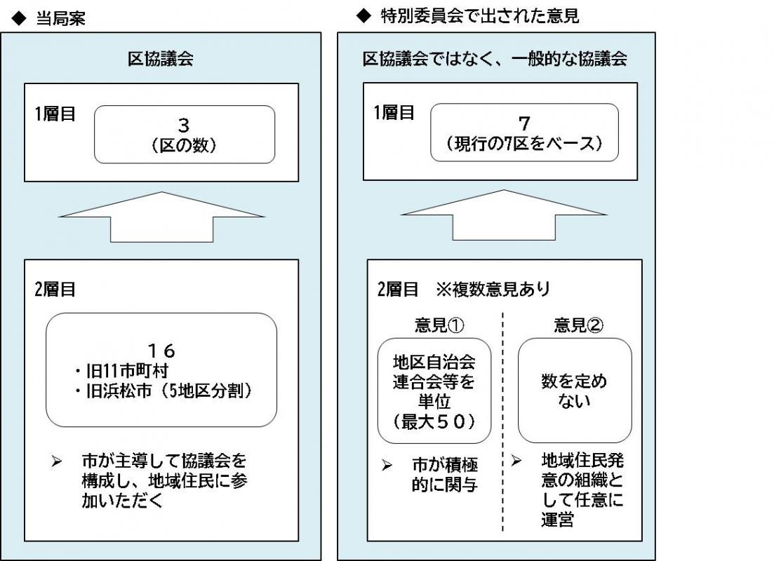 - 特別委員会で出された意見では、1層目を再編後の区の数ではなく、現行の7区をベースに7つの協議会(区を単位とする区協議会ではなく、一般的な協議会)を設置し、2層目は地区自治会連合会等を単位とした最大で50の協議会とし、市が運営に積極的に関与するという意見(意見1)や、協議会の数は定めず、運営についても住民の発意で行うという意見(意見2)などが出されました。
