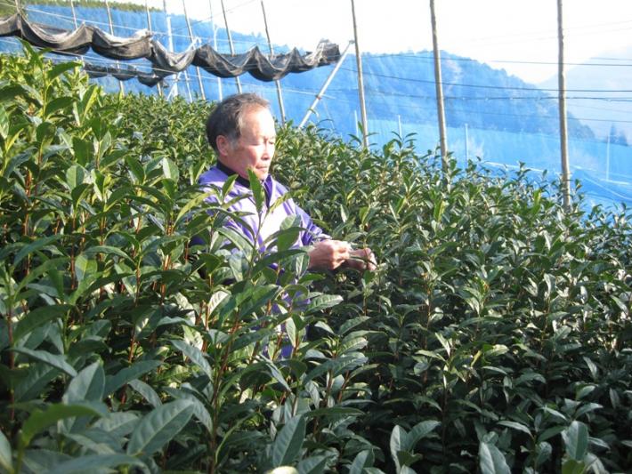 太田昌孝さんが、品評会のお茶として育てている茶の木は、「自然仕立て(ばら木)」。この「自然仕立て」とは、4月下旬に茶摘みを行った後、根株だけを残して刈り取ってしまい、1年かけて背丈ほどの大きさに育てるもの。毎年5月ぐらいから11月下旬ぐらいまでの暖かい時期は、茶の木が生長し続け、冬場の寒い時期になると茶の木の伸びが止まってしまう。その伸びが止まった時点で、茶葉の中でも、力があるものを残し、先端を一つひとつ刈り取ってしまう。残した力のある茶葉は、春に新芽が伸び、4月下旬から終わりにかけて、品評会へ出すお茶として摘み取りを行う。新茶の摘み取りは、約200人の方に手伝ってもらうため、人の手間はかかるし、作業の手間がかかる大仕事なのである。