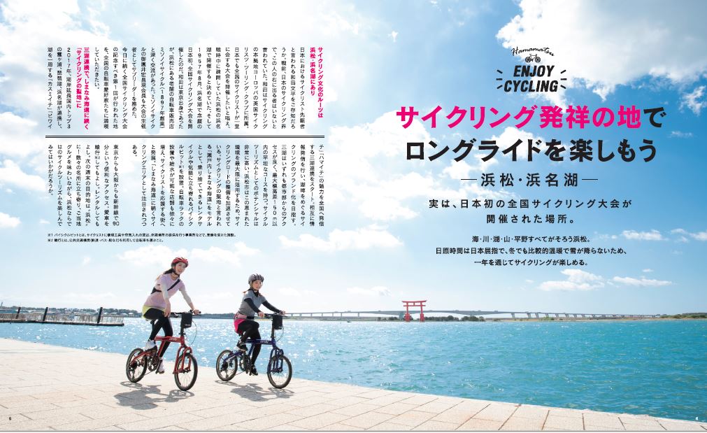 今号は、「サイクリング発祥の地 ハママツライド ENJOY CYCLING」と題して、気候が温暖で一年を通じてサイクリングが楽しめる本市ならではのサイクルツーリズムを特集します。浜松を満喫できるサイクリングコースなどを紹介し、浜松でのサイクリングの楽しみ方と、その魅力を発信してまいります。