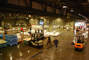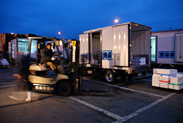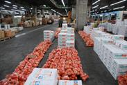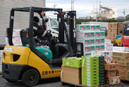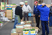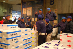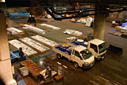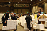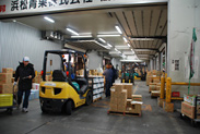 全国各地から大型トラックや保冷車などで多くの魚介類が市場内に運び込まれます。青果も産地から運び込まれます。品物は卸売業者が受け取り、卸売場の決められた場所に並べられます。