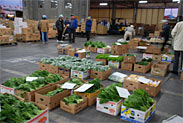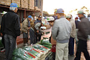 前日の夕方から午前5時頃までに各地から運び込まれた品物を卸売場内に並べます。5時30分から水産のせり、6時30分から青果のせりが始まります。わずか2時間程の間にその日の出荷物は取引され、バイヤー(仲卸業者、売買参加者)が、市場の中にある仲卸業者の店や市場外の販売先等に運びます。仲卸業者は品物を買いやすいように仕分け、買出人や売買参加者に販売します。買出人や売買参加者は、仕入れた商品をそれぞれの店舗や配送先に運び出します。