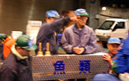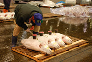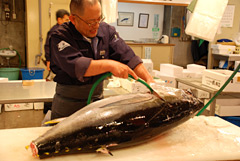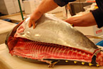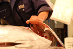 仲卸業者は、小分けして販売するため大きなまぐろを解体します。生まぐろの解体は、仲卸業者のベテランの手によって、ていねいに分けられていきます。