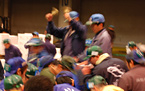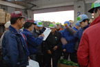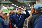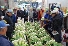 せりは出荷者のせり人の呼びかけに応じて、バイヤーが競争して手振りや指で値段を示して、一番高い値段をつけた人が落札します。